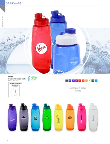 DRINKWARE WATER BOTTLES WBT030 BPA BPA Charisma Water Bottle 700ml FREE FREE BPA free | 700ml 215(h) CH BU P PI R O Y T DGR C Pad Print up to 2 colours BRANDING AREA 40(w) 95(h) combination of colours available A 126