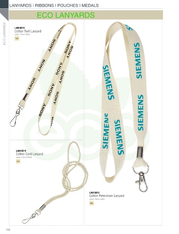 LANYARDS | RIBBONS | POUCHES | MEDALS ECO LANYARDS ECO LANYARDS LAN10015 Cotton Twill Lanyard cotton | 10(w) 1000(l) NA LAN10019 Cotton Cord Lanyard cotton | 3.5(w) 1000(l) NA LAN10012 Cotton Petersham Lanyard cotton | 20(w) 1000(l) NA 166