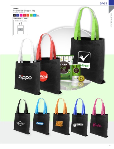 BAGS BAG40001 Rio Shoulder Shopper Bag non woven | 360(w) 430(h) B BU PI R O L C SW Screen Print up to 2 colours BRANDING AREA 200(w) 250(h) BRANDING AREA150(w) 200(h) 80(d) SHOPPER BAGS A 61