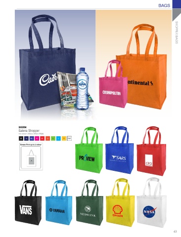 BAGS SHOPPER BAGS BAG004 Galena Shopper non-woven | 360(w) 325(h) 220(d) B N BU PI R O L C Y SW Screen Print up to 2 colour BRANDING AREA 200(w) 280(h) A 63