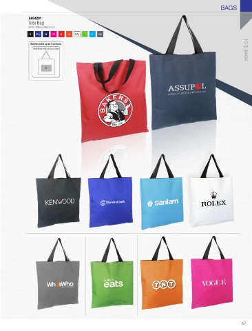 BAGS BAG4201 Tote Bag 600D | 380(w) 380(h) 2(d) B BU N PI R O SW L C GR Screen print up to 4 colours BRANDING AREA 210(w) 150(h) TOTE BAGS A 67